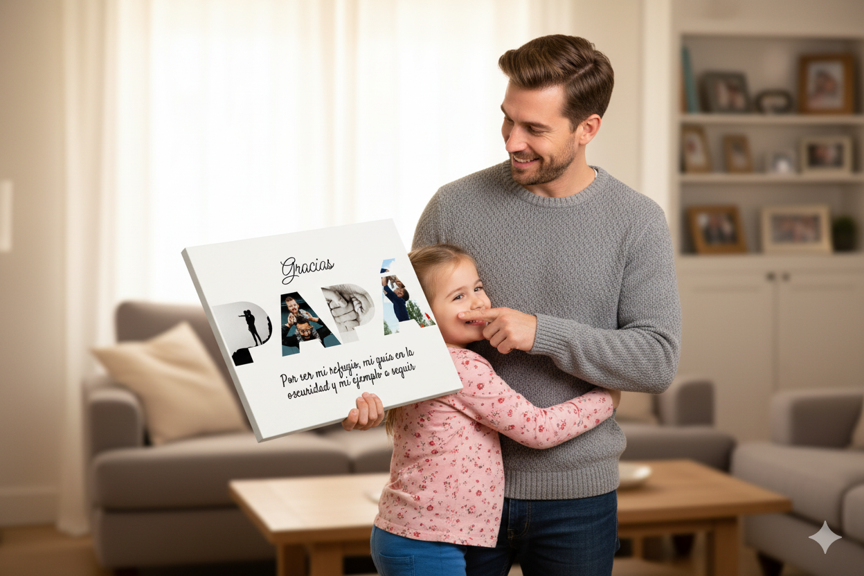 Porque no le estás dando un objeto, le estás dando un momento que sólo es vuestro. Ese lugar donde empezó todo, esa frase que os pertenece, ese día en el que nació la familia. Cuando abra este regalo no va a pensar “qué bonito”, va a pensar “te acuerdas”. Lo va a colgar en casa, lo va a ver cada día, y cada vez que lo mire va a sentir lo mismo que sintió en ese instante. Eso no se guarda en un cajón. Eso se queda para siempre.